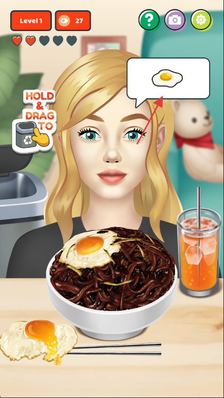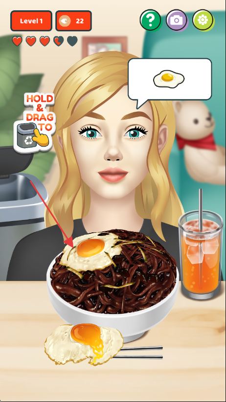 2、按箭头指示【HOLD&DRAG TO】将鸡蛋拖动到碗上,完成食材添加步骤。