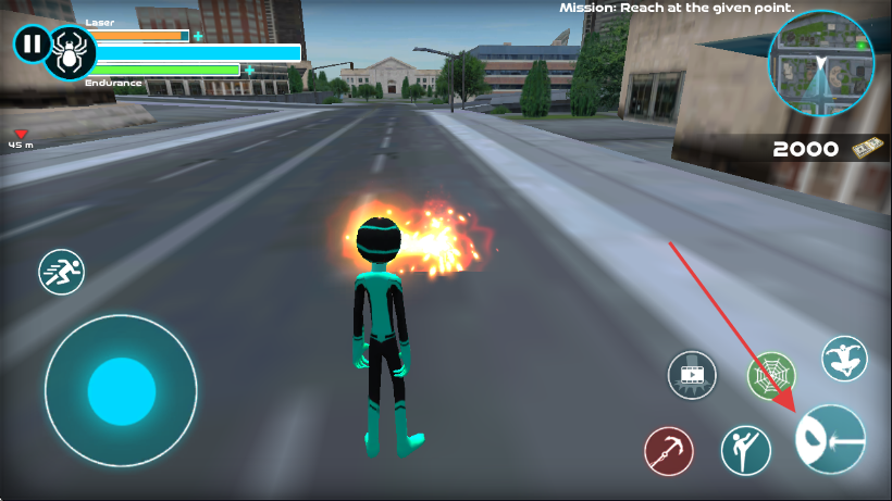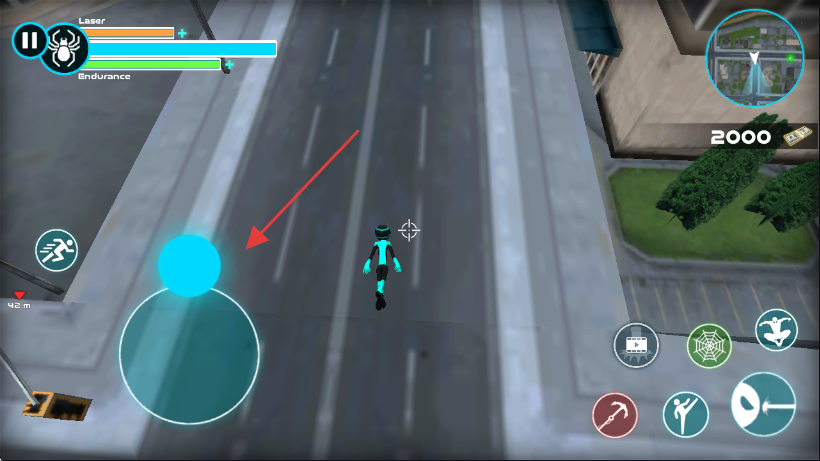 2、通过左下角【蓝色虚拟摇杆】操控角色移动,在城市道路上灵活前行,确保操作顺畅。