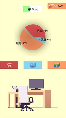 2、办公场景,利用下方功能图标(如购物车等),推进商业或财富经营进程。