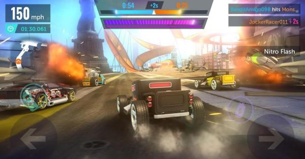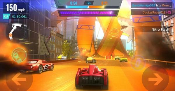 2、在比赛中留意速度如【150mph】,利用道具如【NitroFlash】加速超越对手。