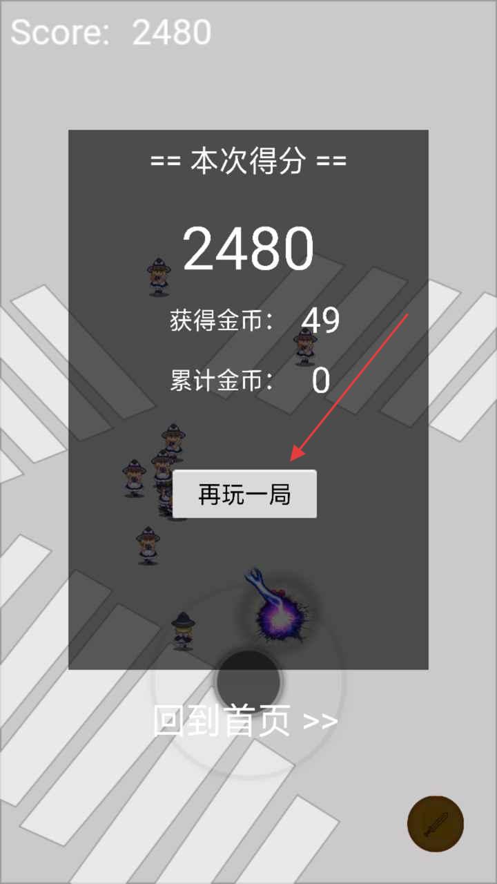 3、游戏结束后,查看“本次得分2480”及“获得金币49”,点击【再玩一局】按钮,重新开始挑战更高分数。