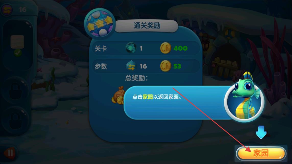 1、进入冒险模式,从第一关开始三消挑战,通过交换相邻方块达成三个同色消除,完成关卡目标后解锁金币奖励,点击空白处为小鱼投喂初始鱼食。