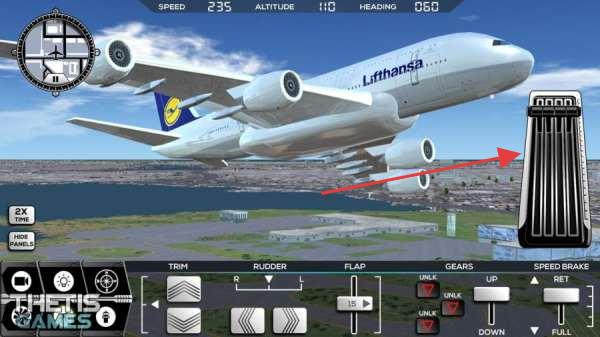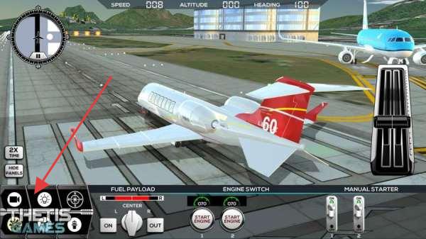 2、在跑道场景,关注飞机状态,利用左下角“THETISGAMES”界面相关按钮,如启动引擎等,准备起飞或滑行。