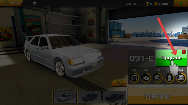2、在车库界面,点击【Upgrade】按钮,对车辆进行性能提升,如速度、加速、操控等方面的强化,增强比赛优势。