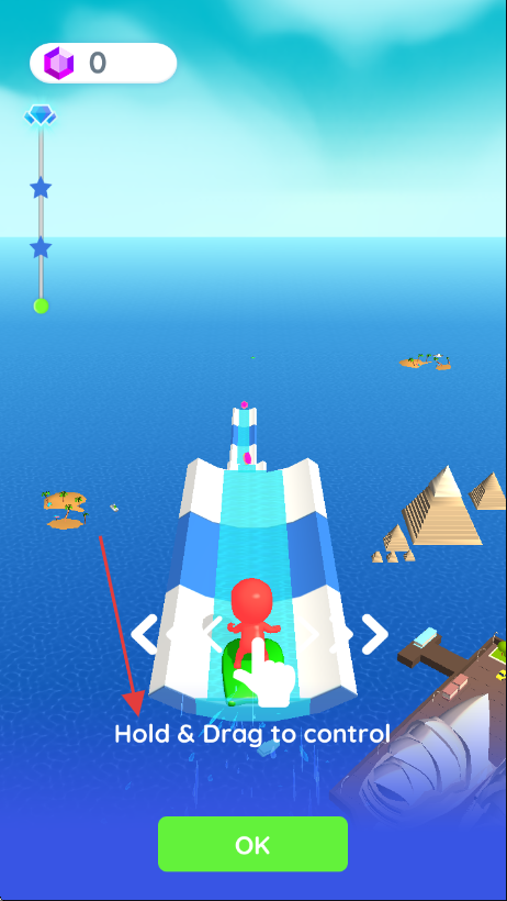 1、进入游戏后根据提示【Hold&Drag to control】按住并拖动控制红色小人在滑道上移动,点击【OK】确认操作。