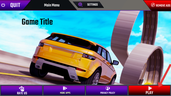 1、进入斜坡赛车空中赛道游戏主界面,点击右下角红色的【PLAY】按钮,开启游戏之旅。