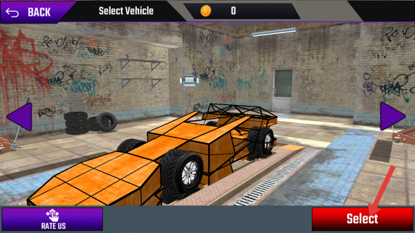 2、在选车界面中,选择心仪的车辆后,点击右下角的【Select】按钮,确认使用该车辆进行游戏。