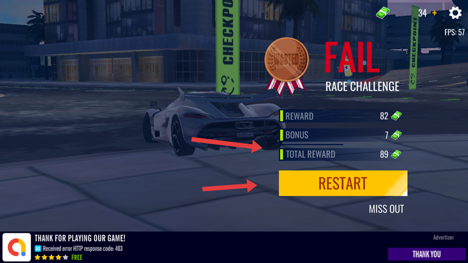 3、每场比赛都能获得奖金,点击下方MISS OUT回到游戏主界面,奖金用于购买车辆。