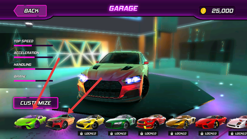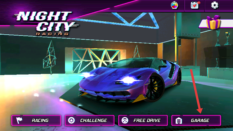 1、进入游戏主界面,右下角有个GARAGE车库,点击进入车库。
