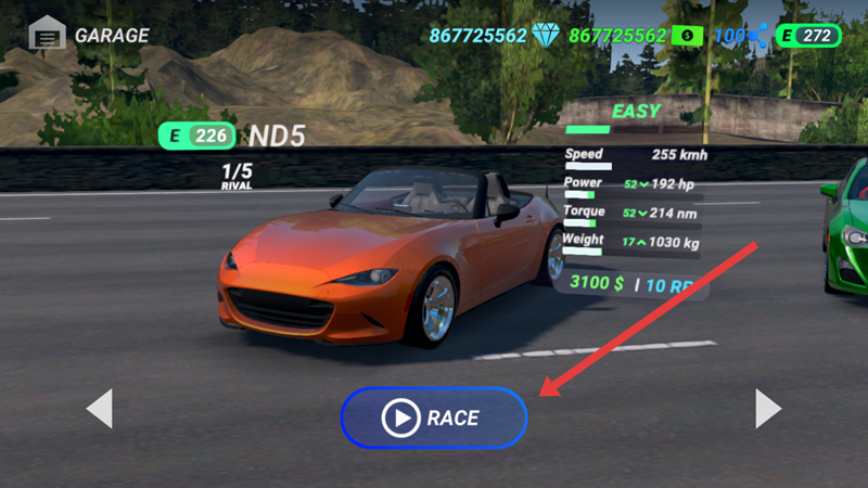 2、比赛前,选择一辆适合该赛道的车辆,每辆车右各自的优点,然后点击RACE。
