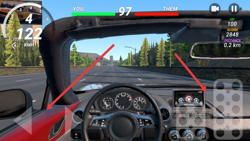 3、左手虚拟方向盘控制方向,右手控制油门刹车,长按漂移键实现甩尾过弯。