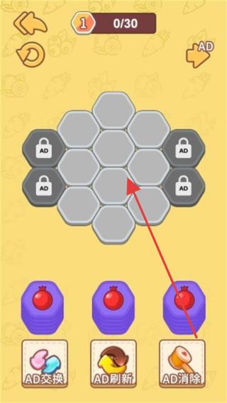 1、在六边形消除关卡,关注【0/30】目标,合理放置紫色方块,利用【AD交换】等道具,消除灰色六边形,完成关卡目标。