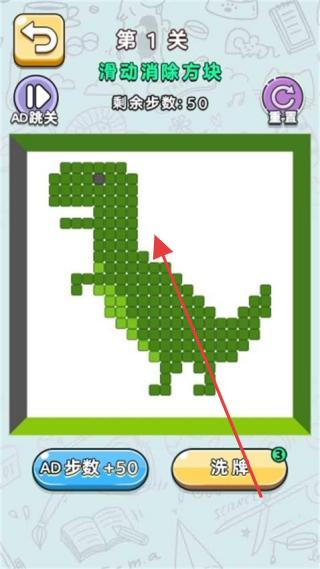 2、第1关滑动消除方块关卡,依据【滑动消除方块】提示,在50步内操作,可使用【AD步数+50】等道具,按图案消除方块通关。
