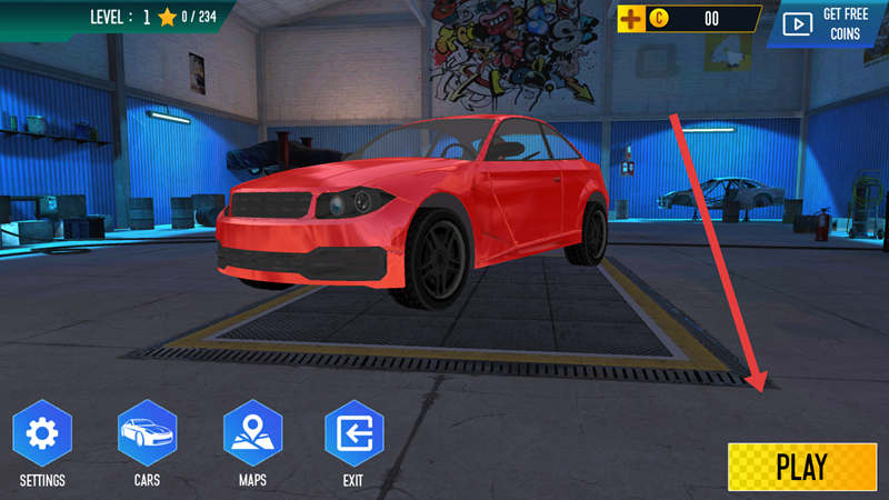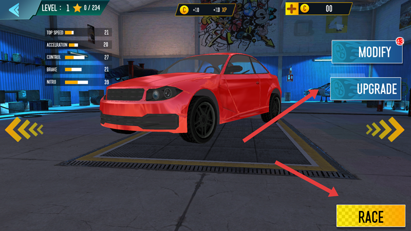 2、依次选择完赛道后会回到车库,你可以先对车辆进行改装升级,然后点RACE开始。