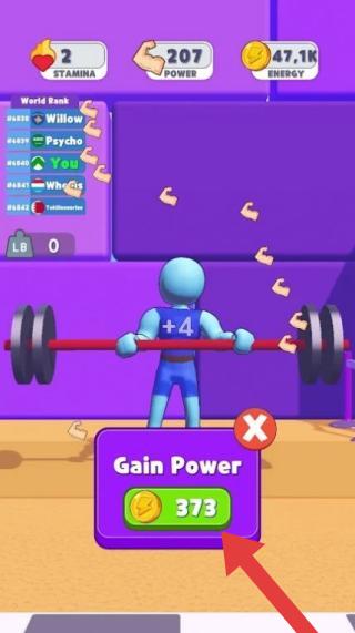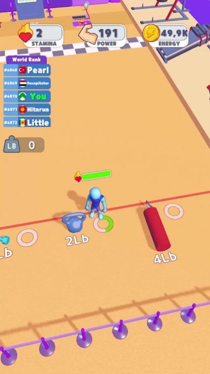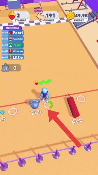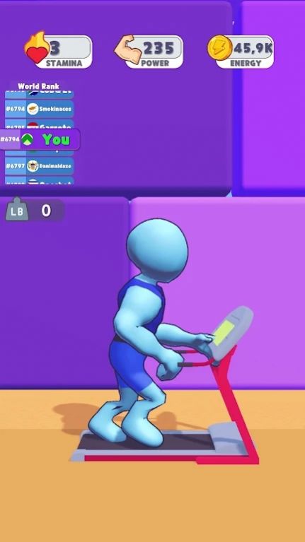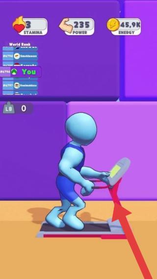 2、画面中的蓝色小人正在进行举杠铃的动作,玩家通过消耗游戏内货币来增强角色力量等属性,在世界排名中争取更高位置。