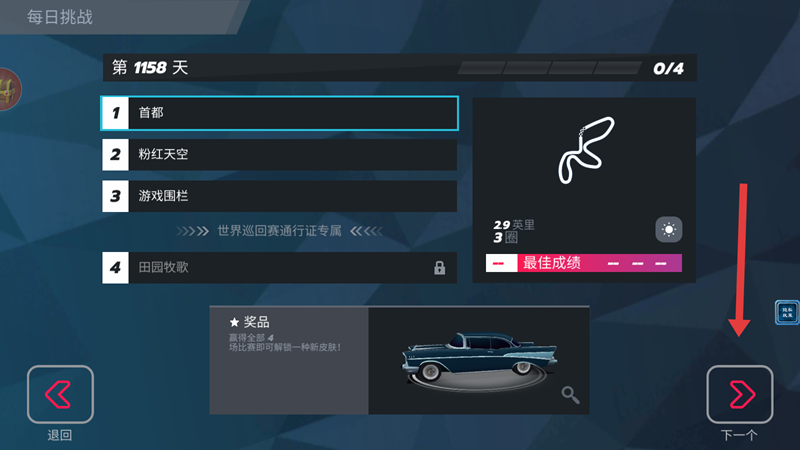 2、选择每日挑战模式,完成奖励赛后可升级赛车,依次选择场地和赛车。