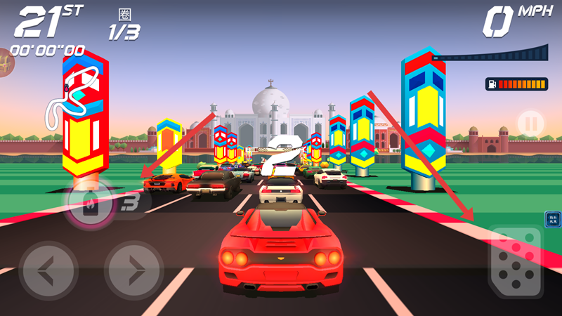3、进入游戏,左手控制方向和氮气爆发加速,右侧长按踏板启动车辆。
