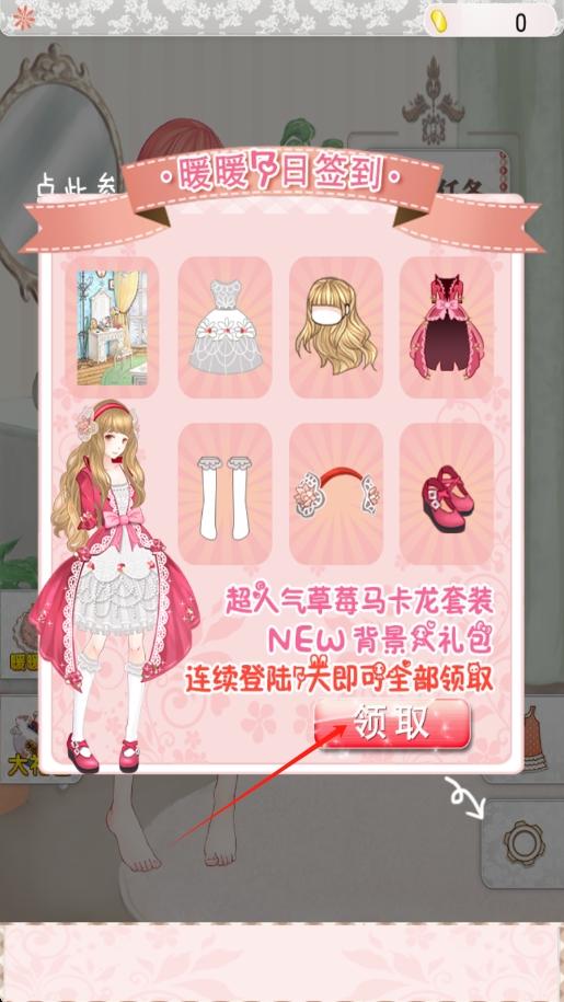 1、进入游戏,在暖暖7日签到界面点击领取,获取超人气草莓马卡龙套装等奖励。