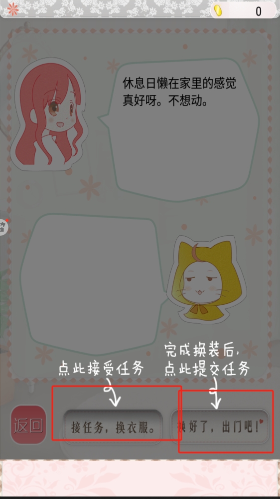 3、在任务对话界面,点击接任务,换衣服,按钮接受任务,完成换装后点击换好了出门吧提交任务。