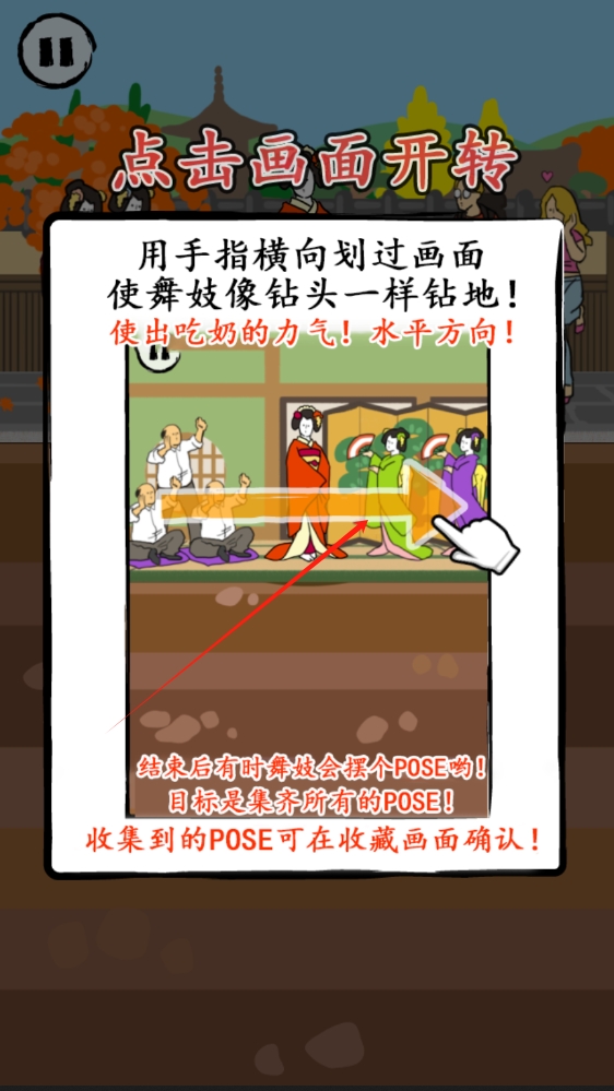 2、按照提示用手指横向划过画面,让舞姬像钻头一样钻地,努力获取不同POSE。