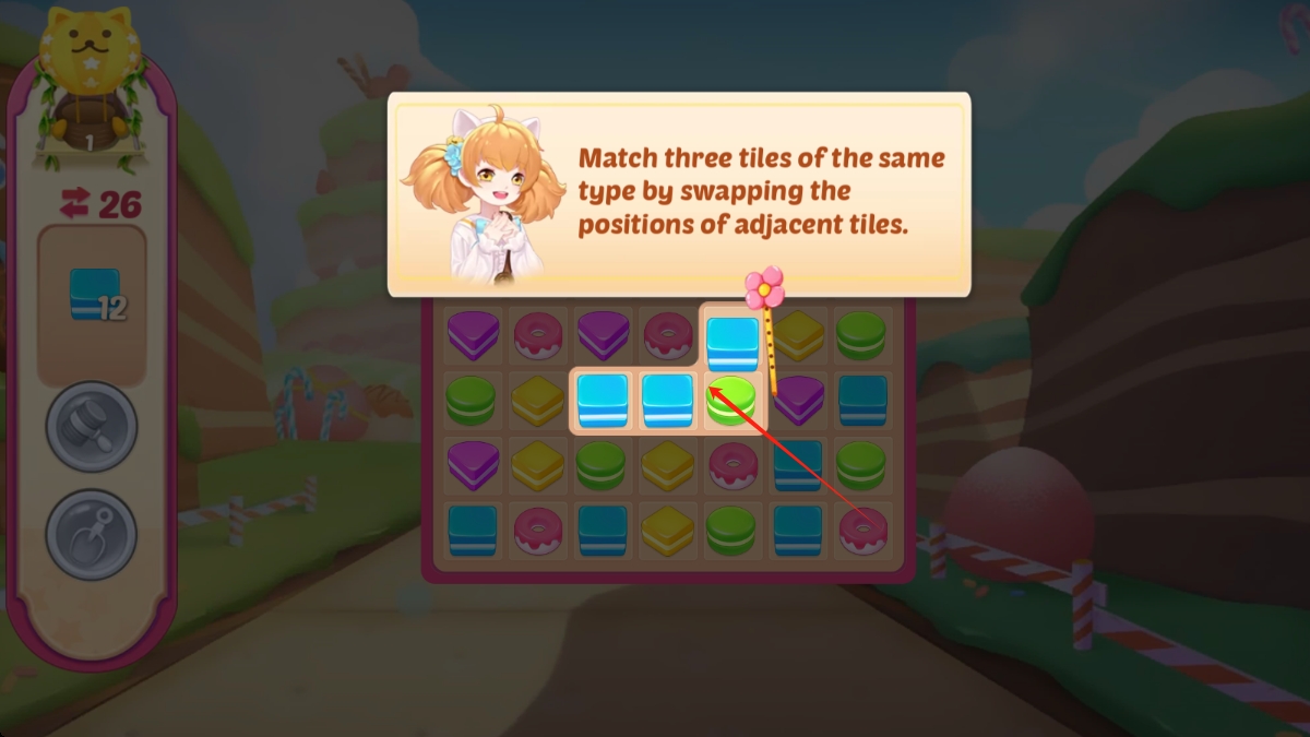 3、进入游戏关卡,按提示交换相邻方块位置,使三个同类型方块匹配消除。