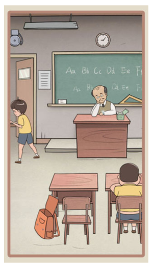 1、视觉表现清新活泼,采用手绘风格的校园场景设计。教室布局还原真实细节,角色动作夸张有趣。