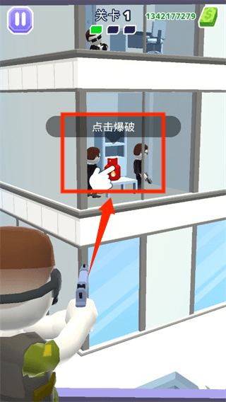 2、观察大楼内部环境,寻找易燃易爆物品,合理利用其特性引爆炸药,通过连锁反应将敌人一网打尽,获取更高分数。
