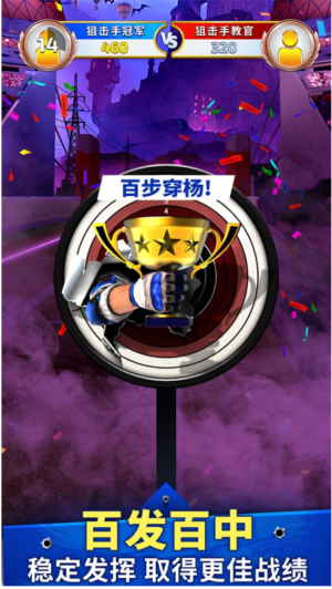 1、首先熟悉操作,游戏采用第一人称视角,滑动屏幕控制准星移动。注意不同靶子的出现规律,固定靶最简单,移动靶需要预判轨迹。