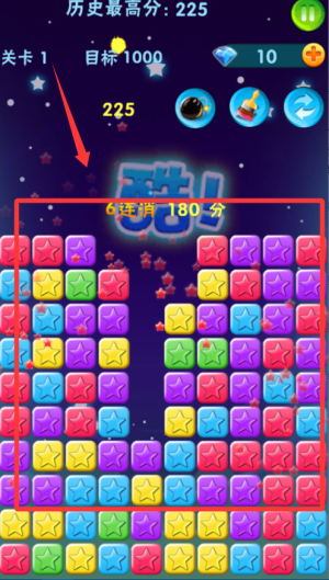 3、高分技巧分享,优先消除底部星星制造连锁反应,合理规划每次消除路径。