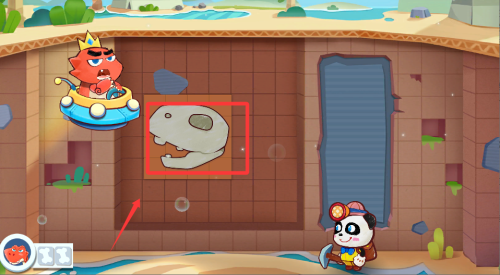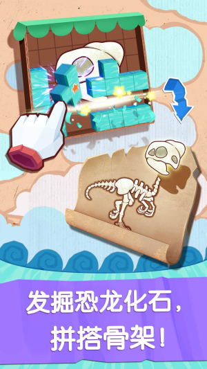 1、基础操作指引,点击使用考古工具挖掘化石,拖动手指清理化石表面,按照提示拼装恐龙骨架。