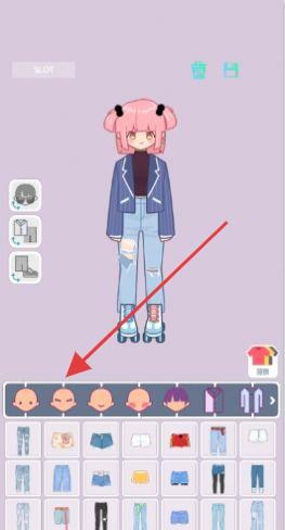 3、进入换装界面后,点击底部箭头指向的头部装饰分类,挑选心仪的发型等部件,自由搭配服装,打造专属时尚造型,体验装扮乐趣。