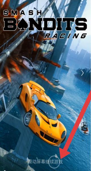 1、在飙车飞盗的游戏启动界面,你需要根据提示进行“滑动屏幕继续游戏”,滑动屏幕进入游戏。