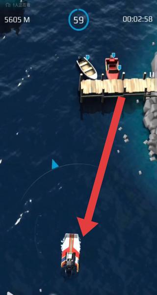 2、若操控船只,如图中所示,驾驶船只驶向码头,注意避开障碍物,按箭头指示方向行进。
