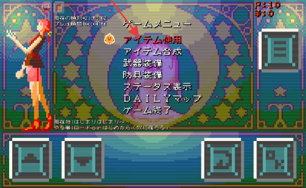 3、打开游戏菜单“ゲームメニュー”,通过“アイテム使用”(物品使用)、“アイテム合成”(物品合成)等选项进行物品管理与装备操作。