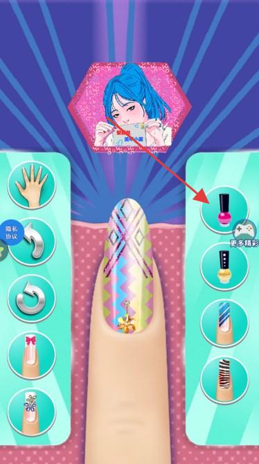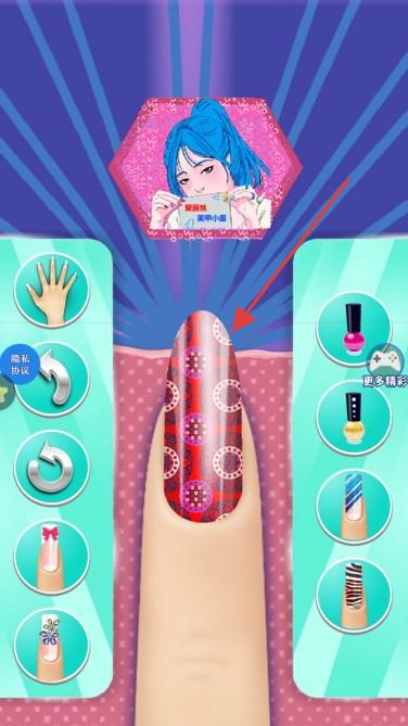 3、再次回到单个指甲装饰,点击箭头指向的右侧指甲油选项,更换不同颜色与图案,打造多样风格,完成专属时尚美甲,尽情体验装扮乐趣。