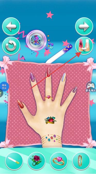 2、在整手装饰界面,点击箭头所指的美甲工具图标,为指甲添加多彩效果,并搭配手饰、纹身等装饰,丰富整体美感,留意每一个装饰细节。