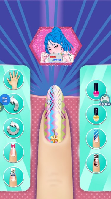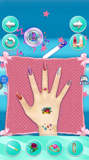 3、沉浸式美甲模拟:细腻动画演示打磨、上色、贴钻等操作细节,指尖滑动模拟刷取甲油触感,搭配“紫外线灯照干”“饰品加固”等真实步骤,营造高度还原的美甲师工作场景。