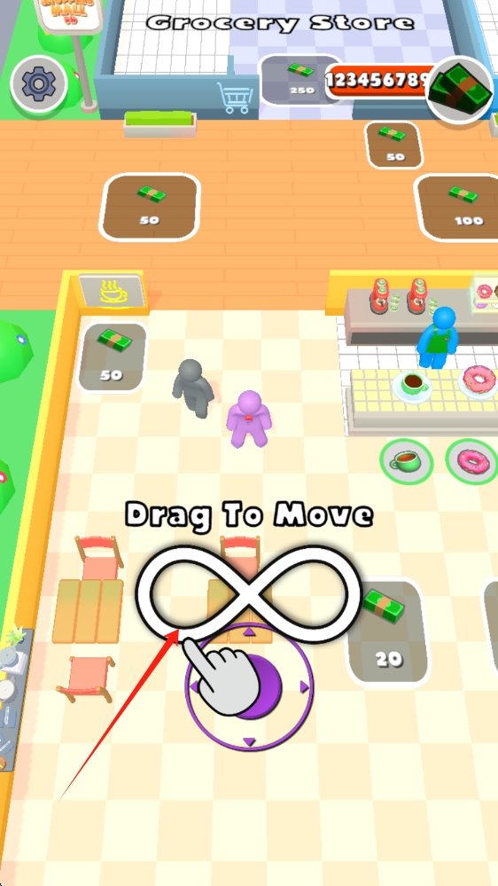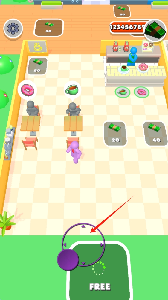 2、拨动轮盘移动人物,关键设施如卫生间与休息区需保持高清洁度,否则影响整体评分,定期升级店铺设备提高服务效率。