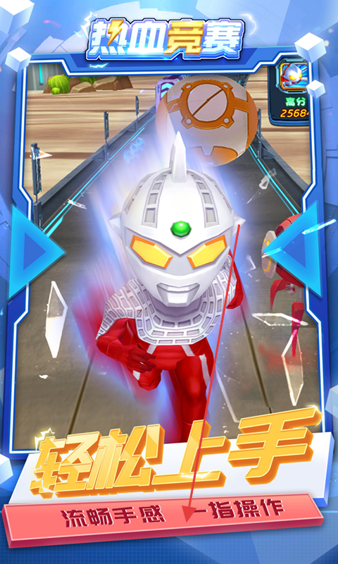 3、还有界面展示“热血竞赛”,奥特曼形象下“轻松上手”标注,“流畅手感一指操作”说明操作简单易控,降低玩家上手难度,提升游戏体验。