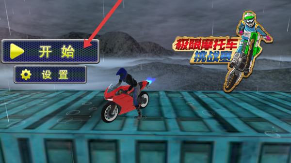 1、进入游戏的界面后,点击【开始】的按钮,正式开启极限摩托车挑战赛的游戏之旅。