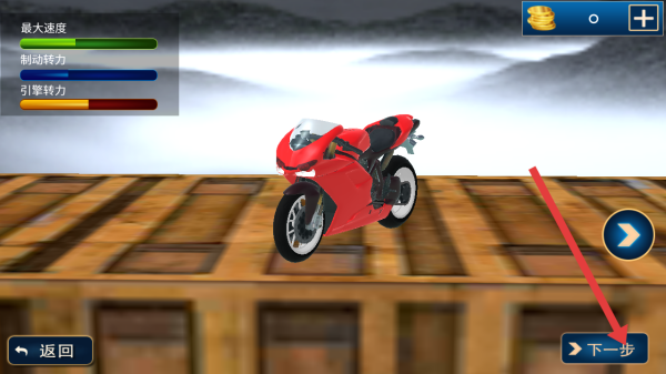 2、在进入游玩前,确认摩托车状态后,点击【下一步】按钮,进入游戏赛道准备环节。