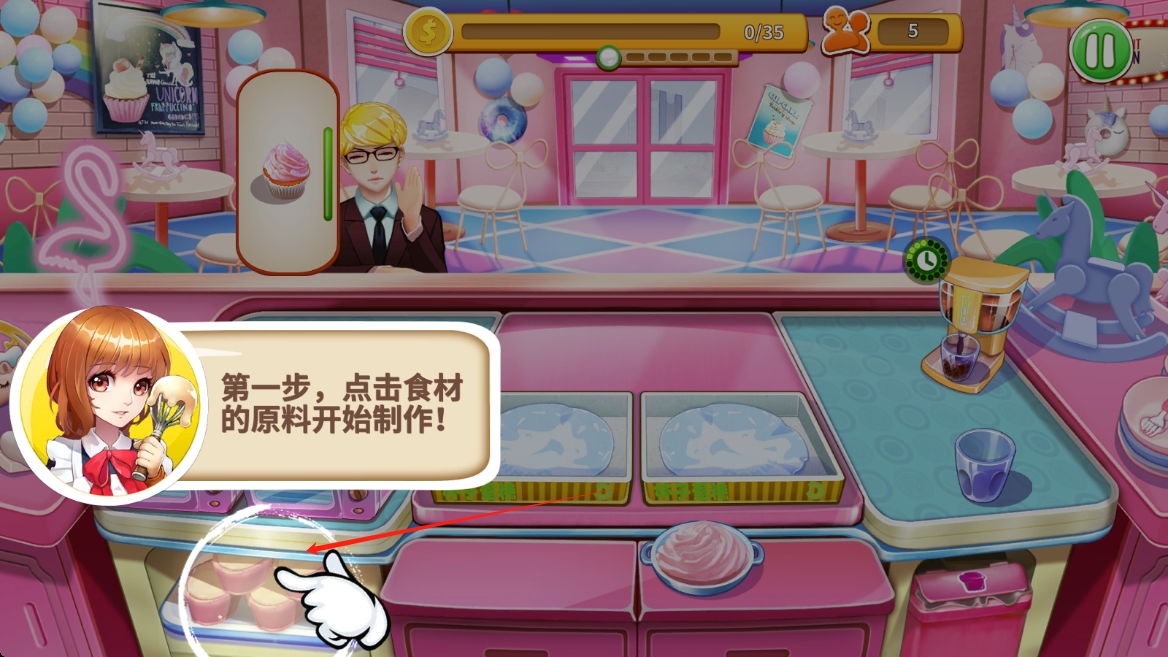 1、在游戏的厨房场景中,按照提示点击食材原料,开始制作食物。