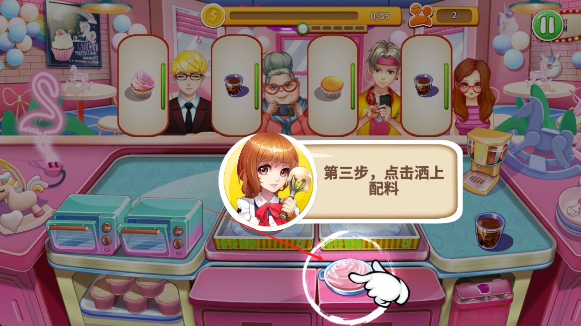 3、最后点击洒上配料,完成食物制作,满足顾客需求。