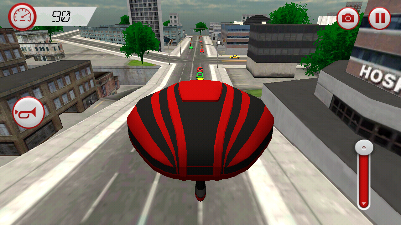 3、留意速度表,通过操作控制红色陀螺列车行驶,利用界面按钮【喇叭、拍照、暂停按钮】来辅助,确保列车在城市道路安全行驶。