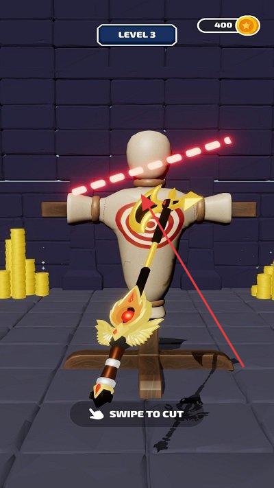 1、玩家通过滑动屏幕控武器切割目标,完成关卡任务。