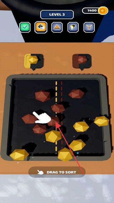 2、玩家在特定关卡中,通过拖动将不同颜色的宝矿石分类放置,关卡中的一个矿石炼制任务环节。