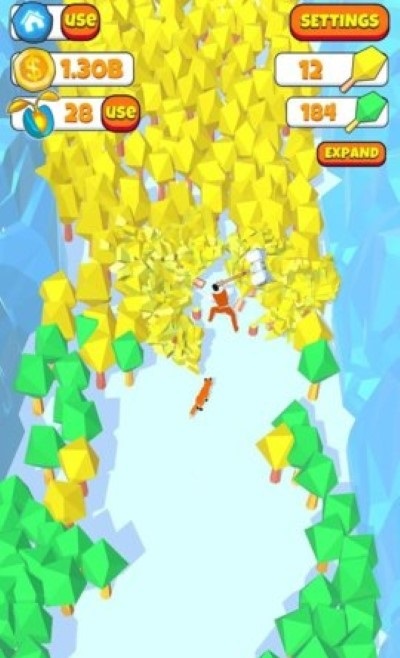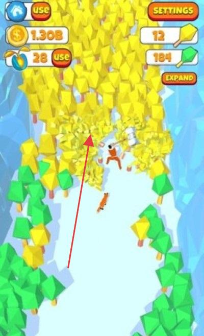 1、进入游戏,留意上方“SETTINGS”等功能按钮,查看金币数值(如1.30B)与道具数量(如28),操控角色在黄色树木间砍伐,开启资源收集之旅。