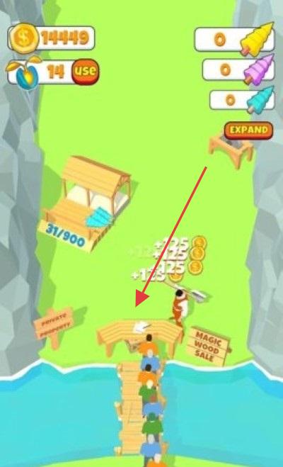 3、完成阶段任务后,场景切换至桥梁、建筑区域,收集金币(如14449),依照提示牌“MagicWoodSale”等指引,推进游戏进程,体验多样玩法。