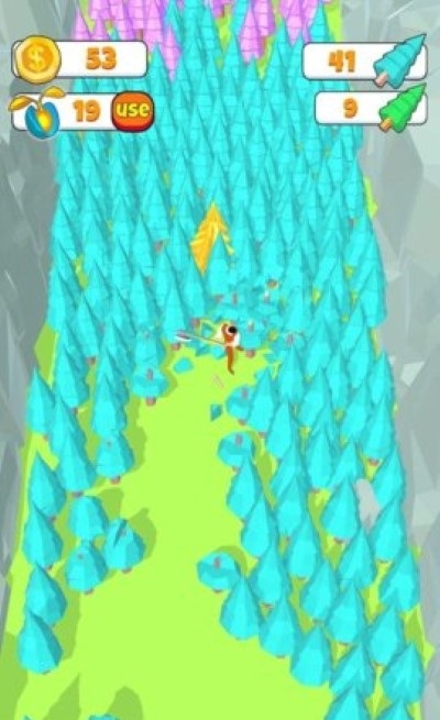 2、游戏树木颜色会变化(如蓝色树木),关注界面数值更新(如金币53、道具数量19),持续砍伐获取更多资源,适应不同场景变化。
