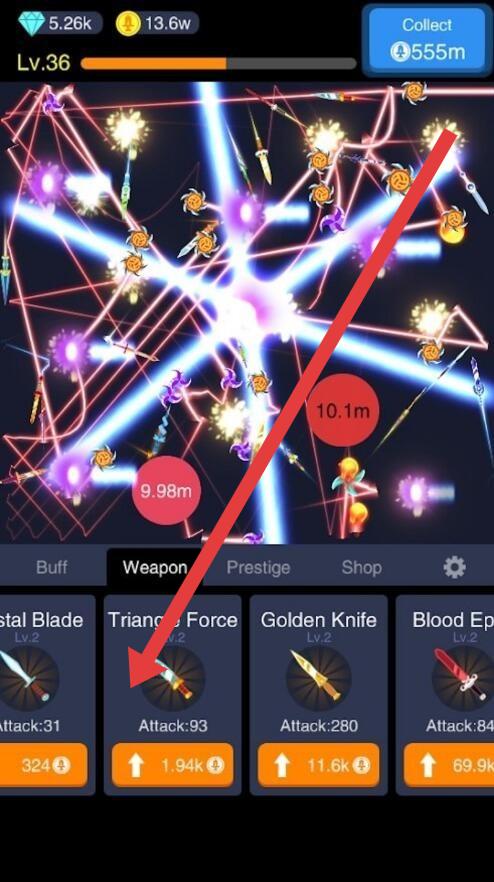 1、游戏中留意界面上方的钻石(5.26k)、金币(13.6w)等资源,达到指定等级(Lv.36)。在【Weapon】栏,按需用资源升级武器(如【Triangle Force】)提升攻击力。